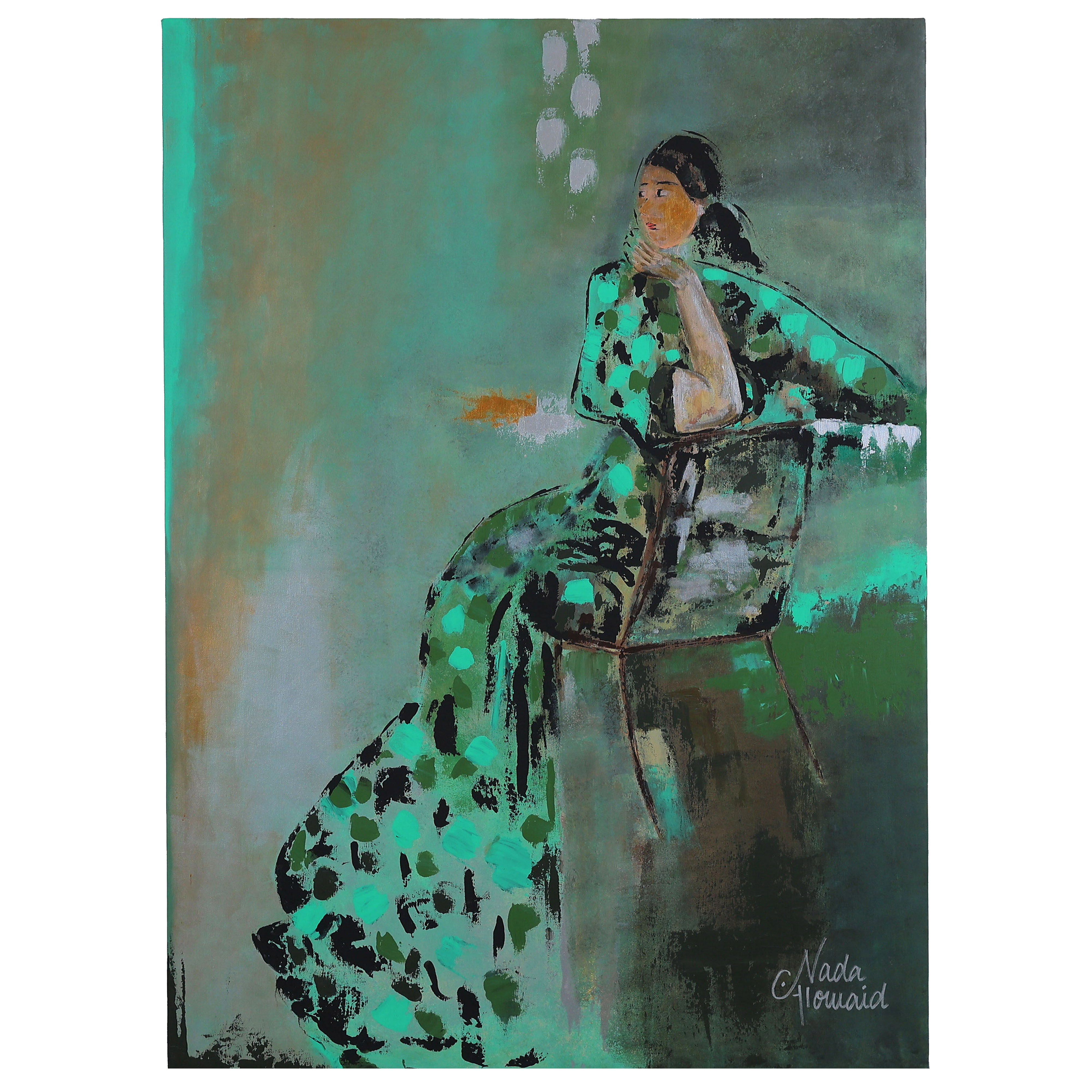 Experience artistic elegance with our handmade drawing capturing a beautiful woman deep in thought as she sits gracefully in a chair perice is per M2